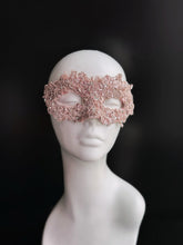 This rose pink lace masquerade mask features an intricate floral lace overlay accented with shimmering rhinestones, designed on a lightweight base for comfortable wear. The soft, romantic tones, combined with elegant detailing, create a refined, graceful statement piece.