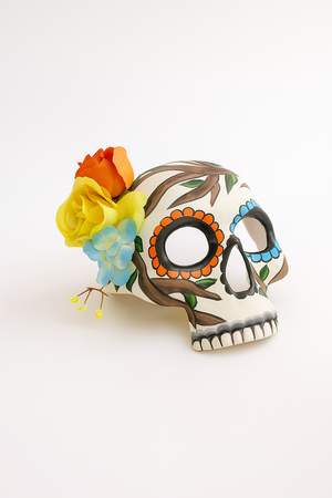 Celebrate Dia de los Muertos with this hand-painted skull mask, featuring bold tree branch designs and a vibrant side flower crown. The colorful eye outlines and unique nature-inspired details make this mask stand out for parades, Halloween, or cultural festivals. A dramatic blend of tradition and artistry.