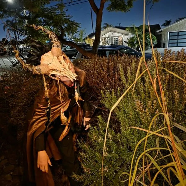 Embrace ancient mysticism with the Samhain Ram Horn headdress. Handcrafted with rustic textures, black feathers, and intricate ropework, it's perfect for pagan rituals, festivals, or statement decor.