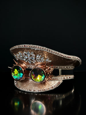 Our rose gold and white sequin captain hat, adorned with a dangling leaf trim and rose gold spikes goggles, is your ultimate accessory for raves, festivals, and parties! The gold spiked goggles, featuring iridescent lenses, add an extra layer of style to your ensemble.