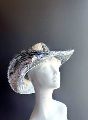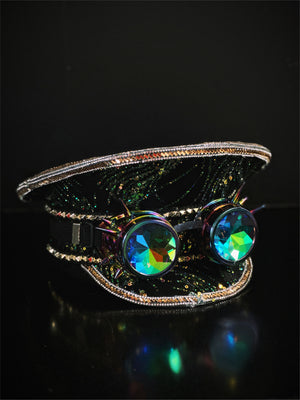 Our white sequin captain hat, adorned with silver trim, is your ultimate accessory for raves, festivals, and parties! The silver spiked goggles, featuring iridescent lenses, add an extra layer of style to your ensemble.