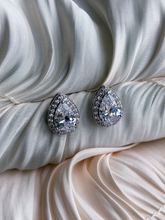 Radiant silver earrings featuring dazzling teardrop-cut crystals encircled by a halo of smaller stones. Hypoallergenic, non-tarnish, and waterproof.