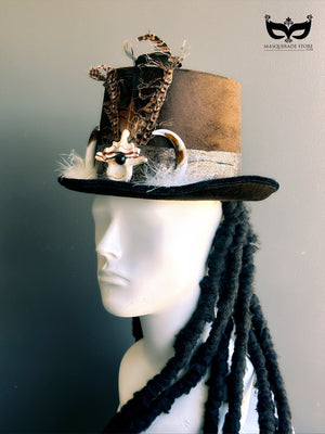 Add vintage elegance to your look with this steampunk cameo top hat. Crafted in warm brown vegan leather with layered fabric bands, it features a Victorian cameo brooch, black cord accents, and trailing tulle for dramatic flair. Perfect for steampunk cosplay, Victorian costumes, masquerade events, or theatrical stage-wear.