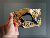 Unleash your bold side with the Ironclad Gears steampunk masquerade mask, crafted in gold, black, and white with mechanical gear details. Perfect for Halloween, cosplay, or masquerade balls, this mask pairs seamlessly with steampunk attire and Victorian costumes.