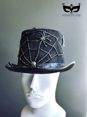 This gothic steampunk top hat features brown lace, satin ribbon, a red rose, a feather, and a skeletal hand accent. Ideal for Halloween costumes, cosplay, gothic weddings, and masquerade events. A bold statement piece that pairs with steampunk or Victorian attire.
