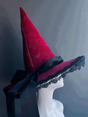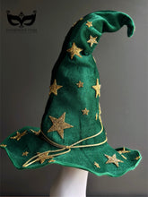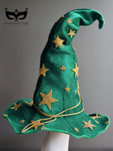 This spellbinding witch hat dazzles with golden stars against a deep green velvet base.