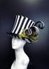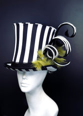 Say it once, maybe twice—this bold black and white striped top hat is full of strange and unusual charm. With wild curls and ghostly green feathers, it's perfect for those who like their style a little... beetle-y. Ideal for Halloween, cosplays, or afterlife affairs!