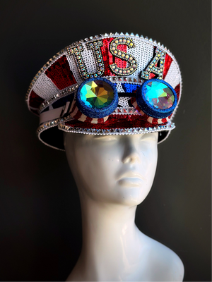 Shine bright with this USA sequin cowboy hat! Featuring red, white, and blue sequins with rhinestone lettering, perfect for patriotic celebrations.