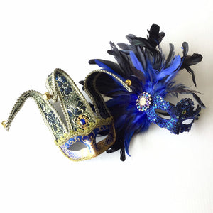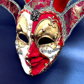 Embody the essence of Venetian carnival with this elaborate Venetian Jester Mask in red and gold.