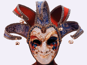 Featuring a hand-painted design with intricate gold filigree and musical notes, this mask boasts a striking red and white split face with a unique half-smile expression. The jester points are adorned with luxurious red fabric and small bells that jingle with each movement, adding a touch of authenticity to your masquerade ensemble. Perfect for Mardi Gras, carnival celebrations, or as a statement piece for masquerade parties.