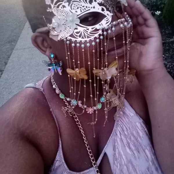 A timeless Venetian mask featuring antique crackle detailing, elegant scrollwork, and bold black and silver harlequin patterns. Perfect for masquerade balls and theatrical events.