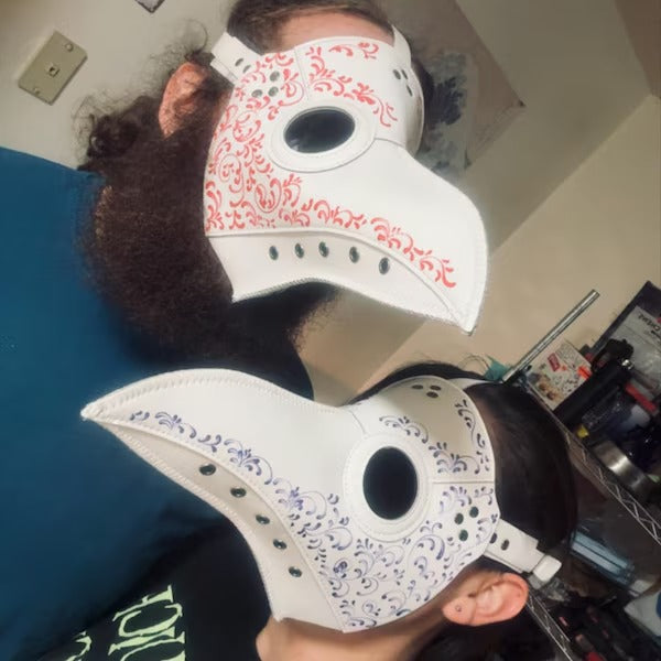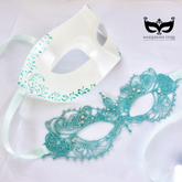 Turn heads with this light blue couples masquerade mask set. The men’s mask features a sleek white base with delicate blue scroll accents, while the women’s mask dazzles in light blue lace adorned with rhinestones. Perfect for weddings, prom nights, Venetian balls, and elegant parties.