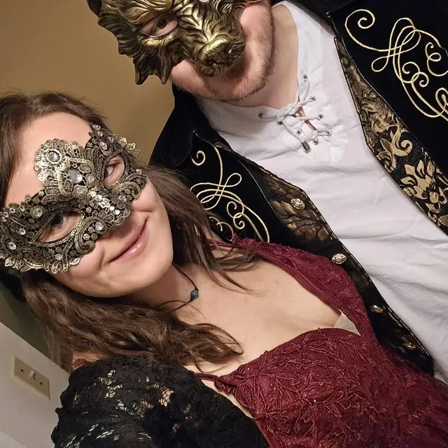 A graceful white mask featuring elegant scrollwork, delicate tulle, and soft feather accents. Perfect for weddings, formal events, and galas.
