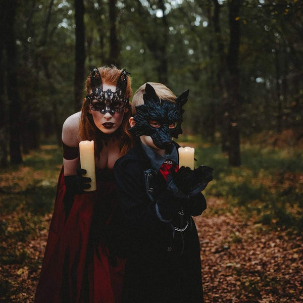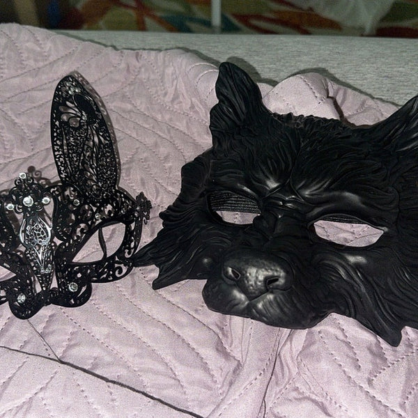 Unleash your dark allure with this couple’s masquerade mask set. The men’s mask features a fierce black wolf design with red accents, while the women’s mask offers a delicate contrast in black lace bunny style with elegant scrollwork. A dramatic pairing for masquerade balls, Halloween parties, or themed events where mystery meets wild allure.