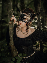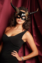 Step into the realm of mystical enchantment with our women's longhorn masquerade mask adorned with a blend of gold and black with forest leaves, Snake and moss. This mask captures the essence of mythical creatures and the allure of nature, infusing your look with a touch of majesty and forest-inspired allure.