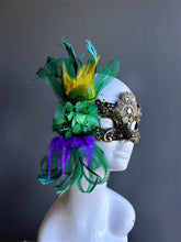 Gold masquerade mask for women with rhinestone accents, green floral ribbons, and Mardi Gras feathers in yellow, purple, and green - perfect for parades, balls, and themed parties.