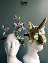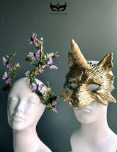 Bring fairytales to life with this mystical couples set. The gold unicorn wolf mask pairs perfectly with the moss-covered butterfly crown for a magical forest look, ideal for Halloween, cosplay, or masquerade adventures.